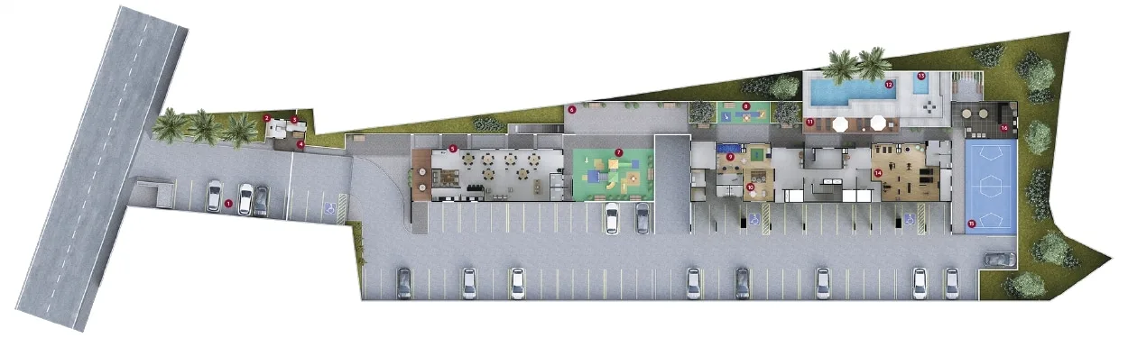 Playground O playground principal está estrategicamente localizado ao lado do Salão de Festas, servindo também como uma área de recreação ao ar livre durante festas infantis realizadas no salão.