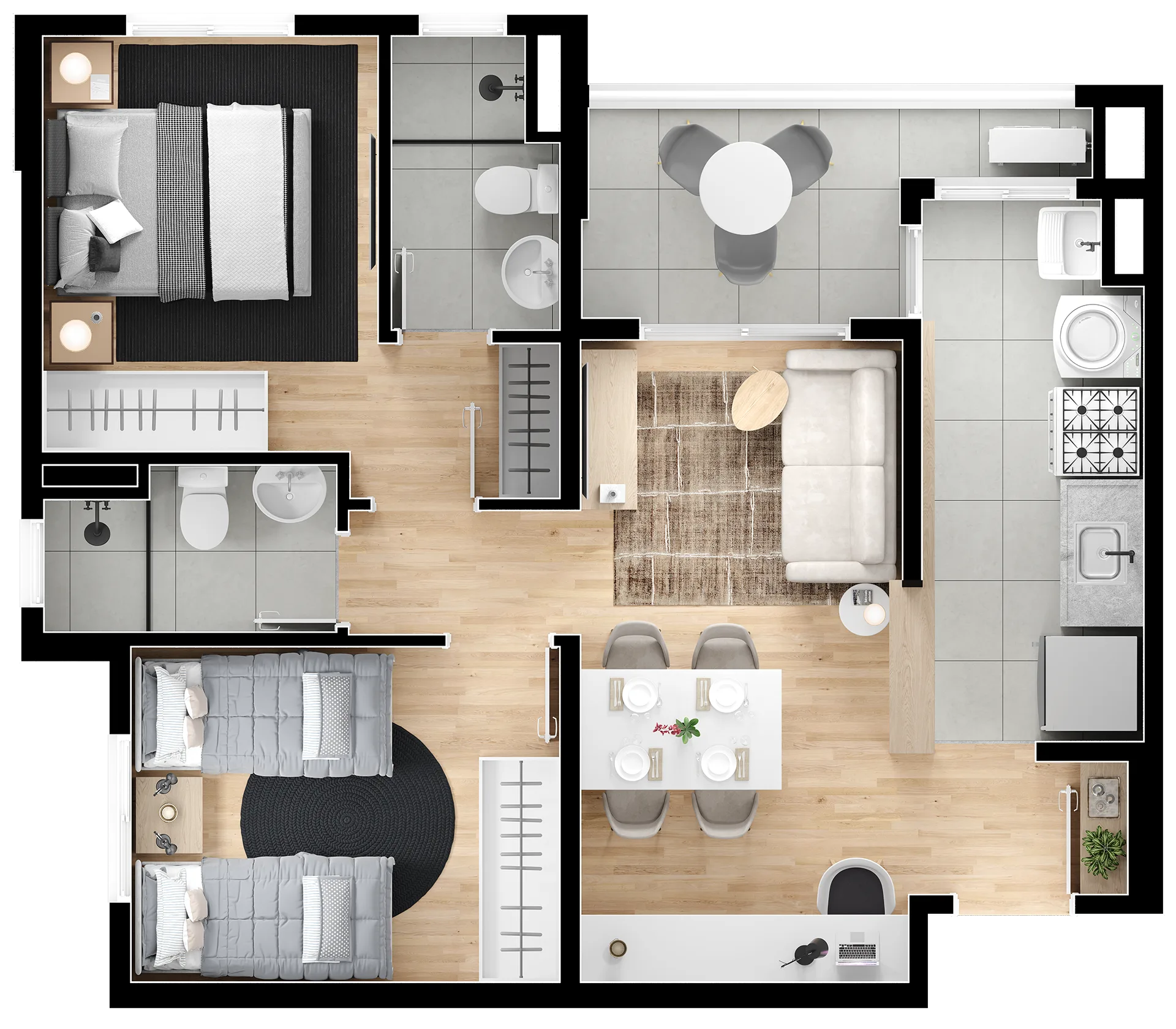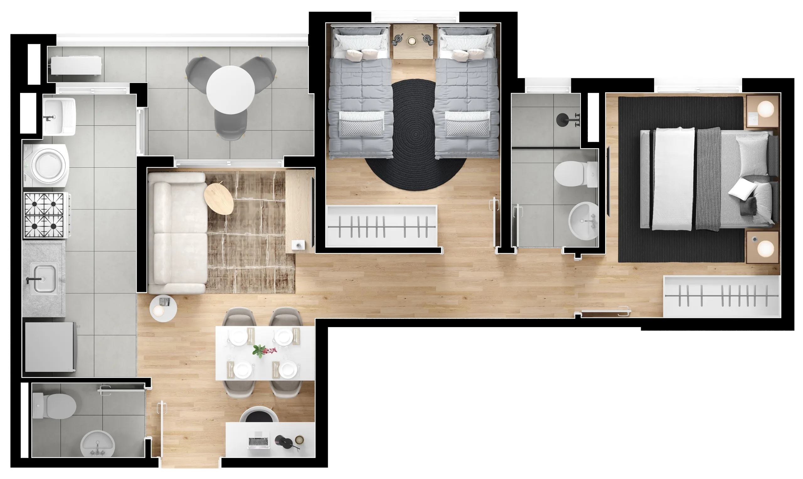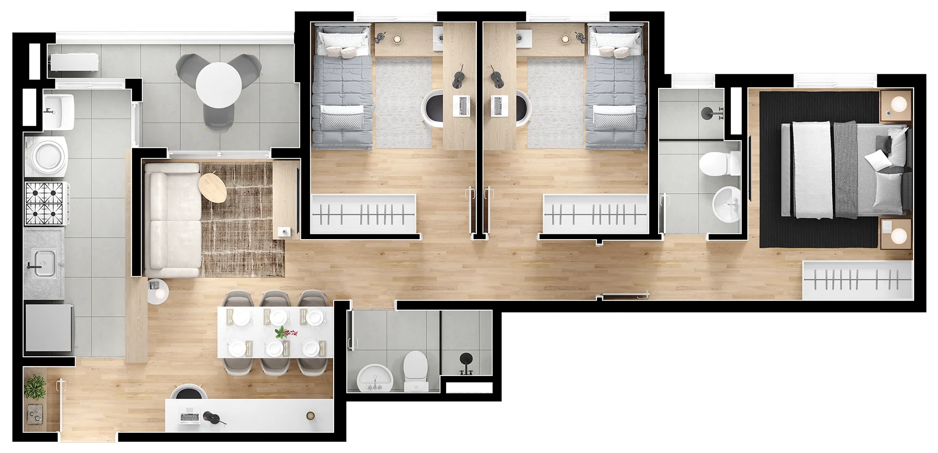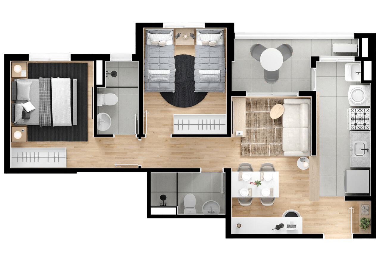 2 e 3 dormitórios com suíte Varanda integrada à cozinha Apartamentos de 53 a 70m²
